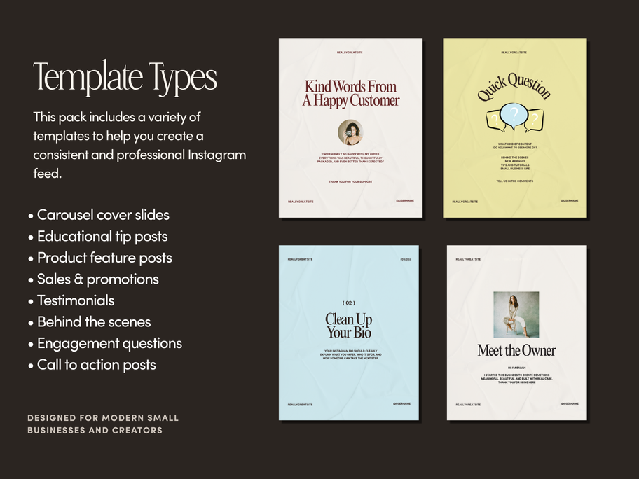 Whether you're sharing announcements, promotions, tips, or behind-the-scenes moments, this template pack makes it easy to create beautiful content that reflects your brand.